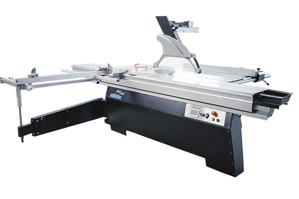 Bedientableau in Augenhöhe platziert einschließlich einer wegschwenkbaren Kreissägen-Schutzvorrichtung und einer Komfort-Tischverbreiterung .Sinnvoll beim Auftrennen großer Platten.